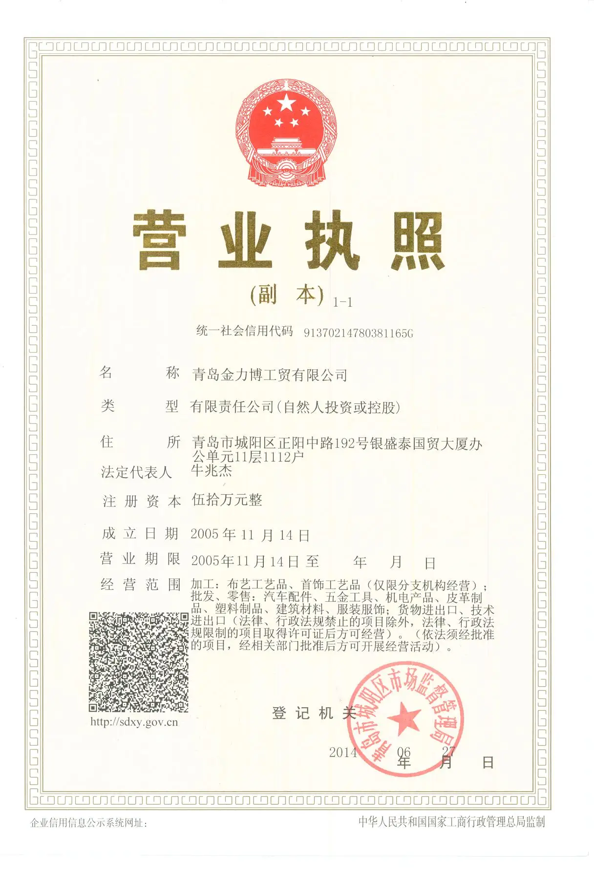 Registered address : 1112 households, 11th Floor, Office unit, Yinsheng Tai International Trade Building, 192 Zhengyang Middle Road, Chengyang district, Qingdao city Qingdao Shandong China